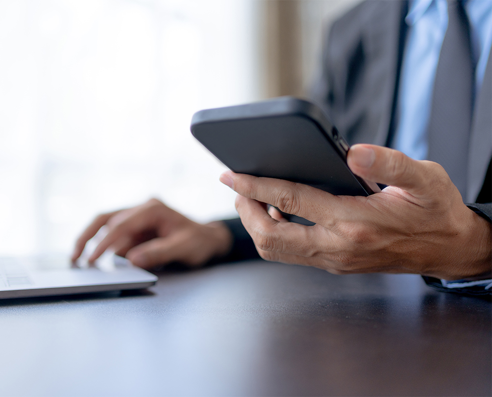 Businessman using smartphone to send text messages in the office
